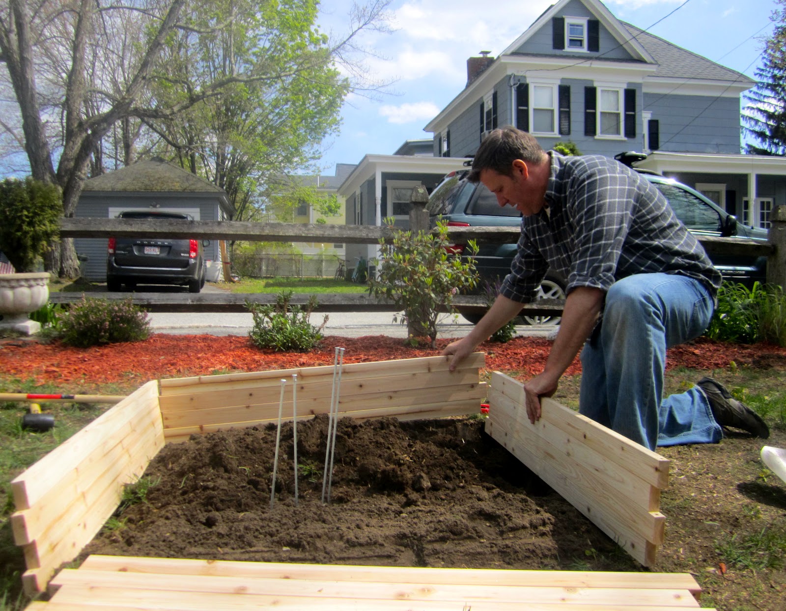 Once the frame was in place, Eric pounded some metal posts into each corner to secure it. Meanwhile, I filled any gaps between the wood and the ground with excess dirt. Then we raked the soil once more to level the area.